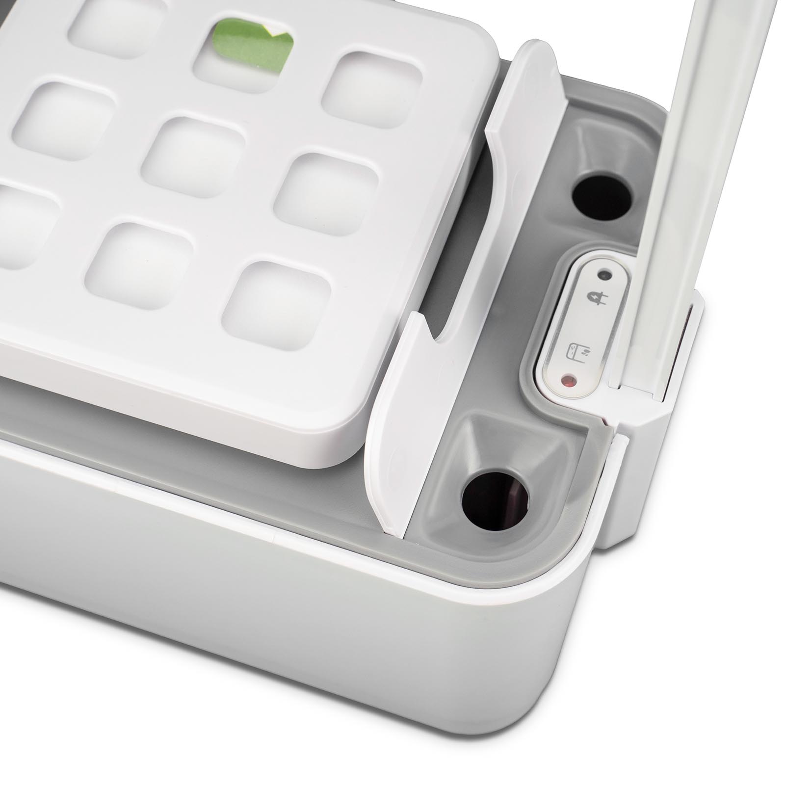Резервуар для воды с разъемами для горшков и откидным клапаном для долива воды, с интегрированной системой контроля уровня жидкости и адаптером для установки лампы